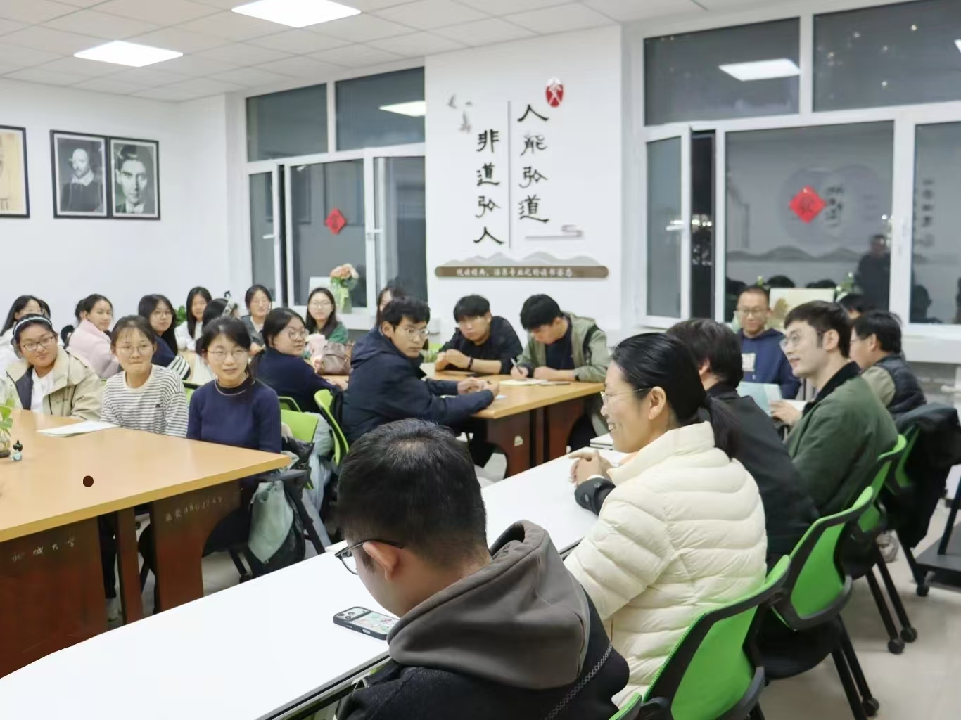 师生互动环节,同学们踊跃提出学业困惑,老师们结合自身经历与教学经验,逐一耐心解答。针对“如何在课堂上保持注意力”的问题,郭鹏飞强调要养成良好生活习惯、保证充足休息;王烨则建议学会独立思考,将枯燥知识转化为个人见解。面对同学们的前途迷茫,马芳建议:“主动适应环境,合理安排学习与生活时间,明确自我需求,涵养自己认知与批判能力。”针对考研问题,郭鹏飞结合自己求学经验耐心解答,强调要找到适合自己的考研道路。答疑尾声,同学们反响热烈,纷纷表示收获颇丰。本次师生座谈会最终在和谐融洽的氛围中圆满落幕。